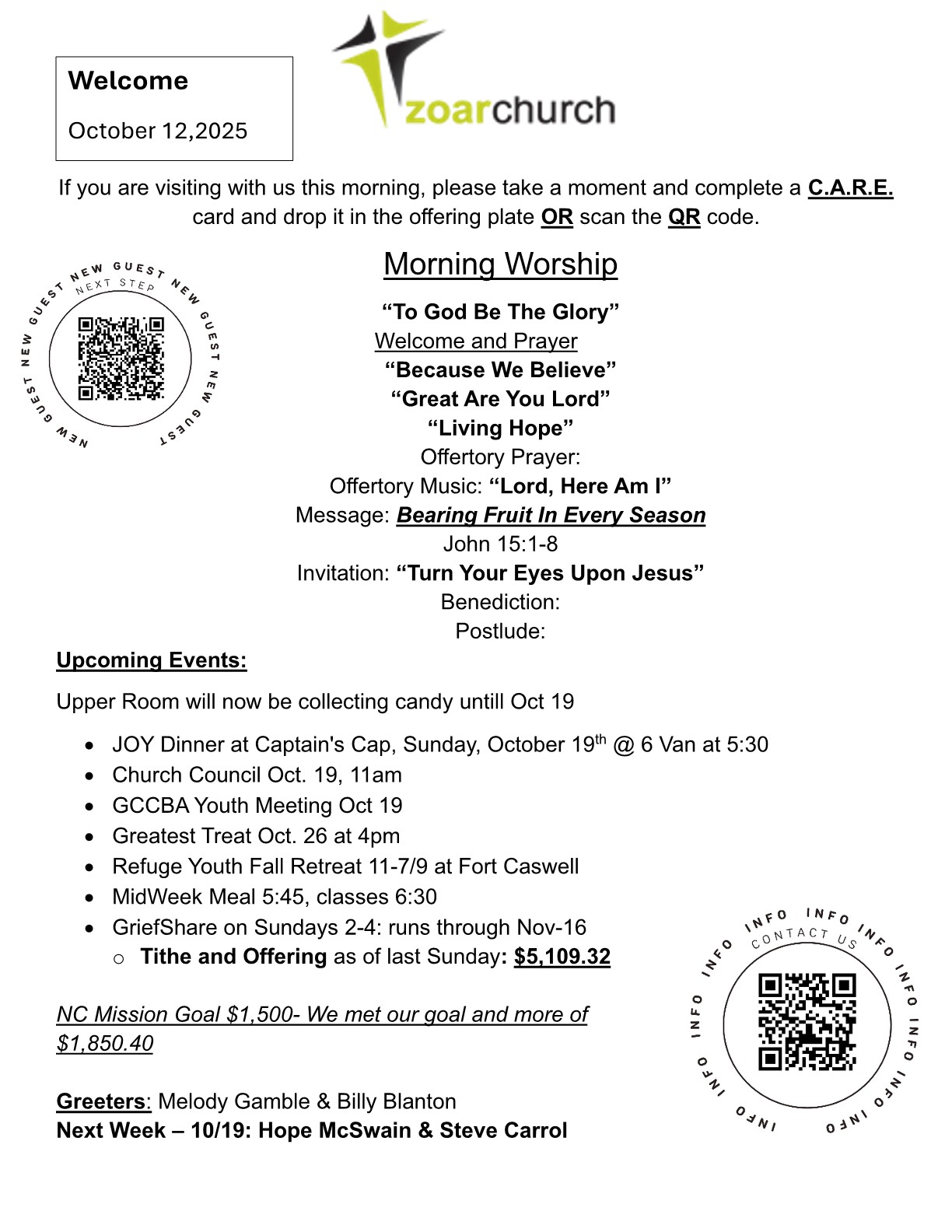 Each week at Zoar we gather as a family of faith, and our bulletin helps keep you connected to what God is doing in and through our church. Inside you’ll find announcements, upcoming events, ministry opportunities, and prayer needs. We believe Zoar is a place of refuge—just as the name reminds us—and this bulletin is one way we invite you to be part of that refuge and community. Whether you’re new or a longtime member, we encourage you to download the weekly bulletin and stay involved in the life of our church. Download today:
